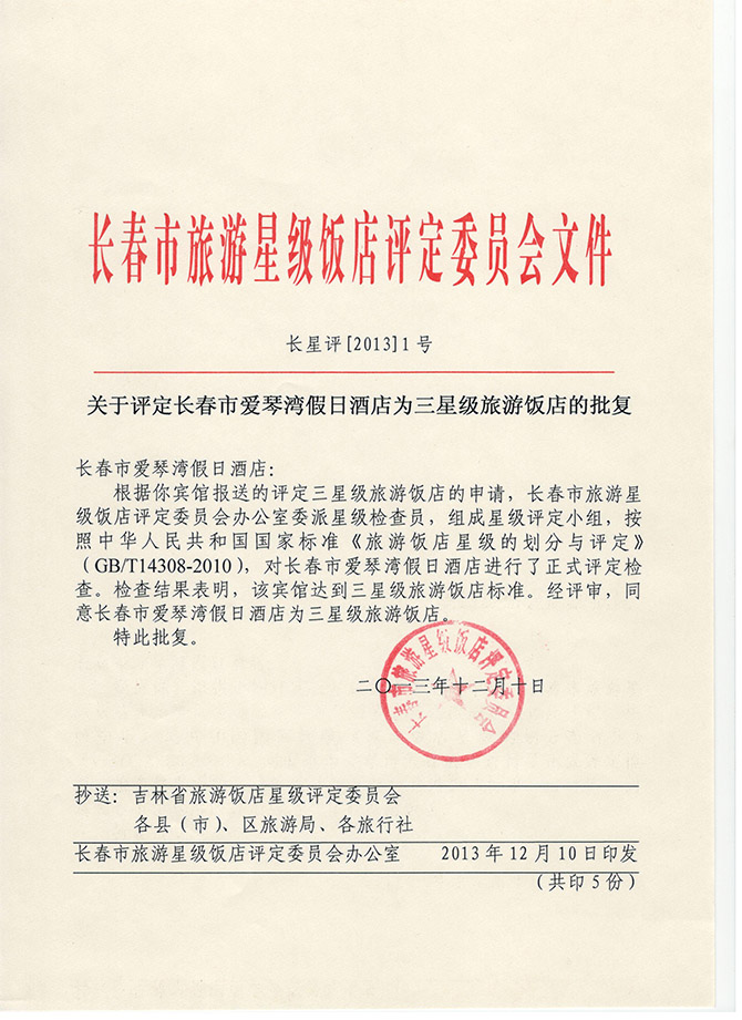 关于评定长春市爱琴湾假日酒店为三星级旅游饭店的批复