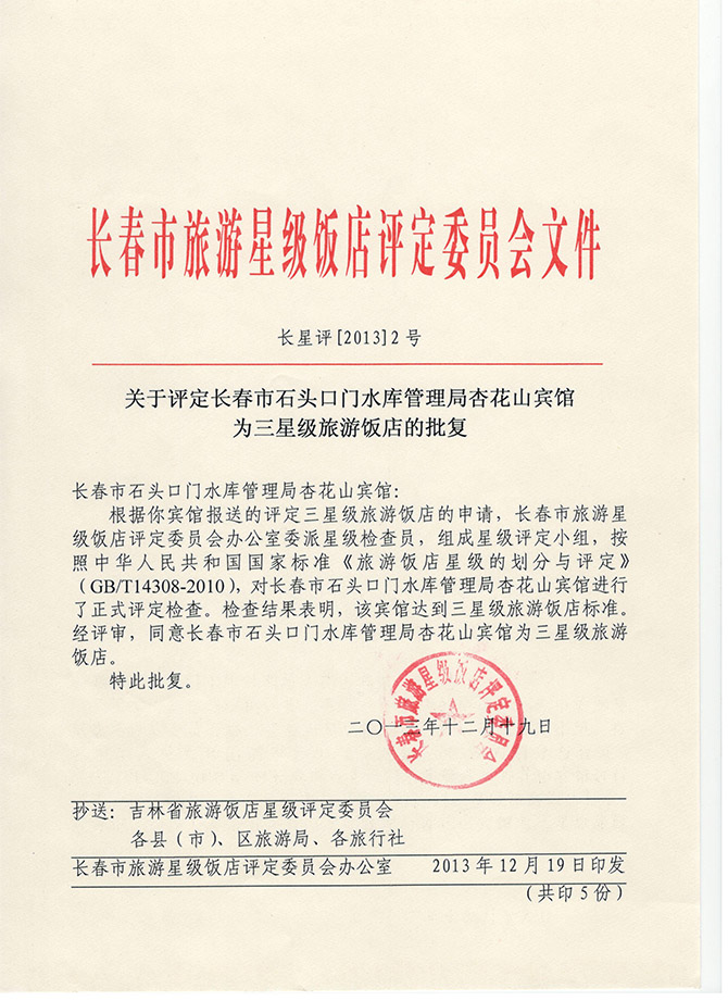关于评定长春市石头口门水库管理局杏花山宾馆为三星级旅游饭店的批复